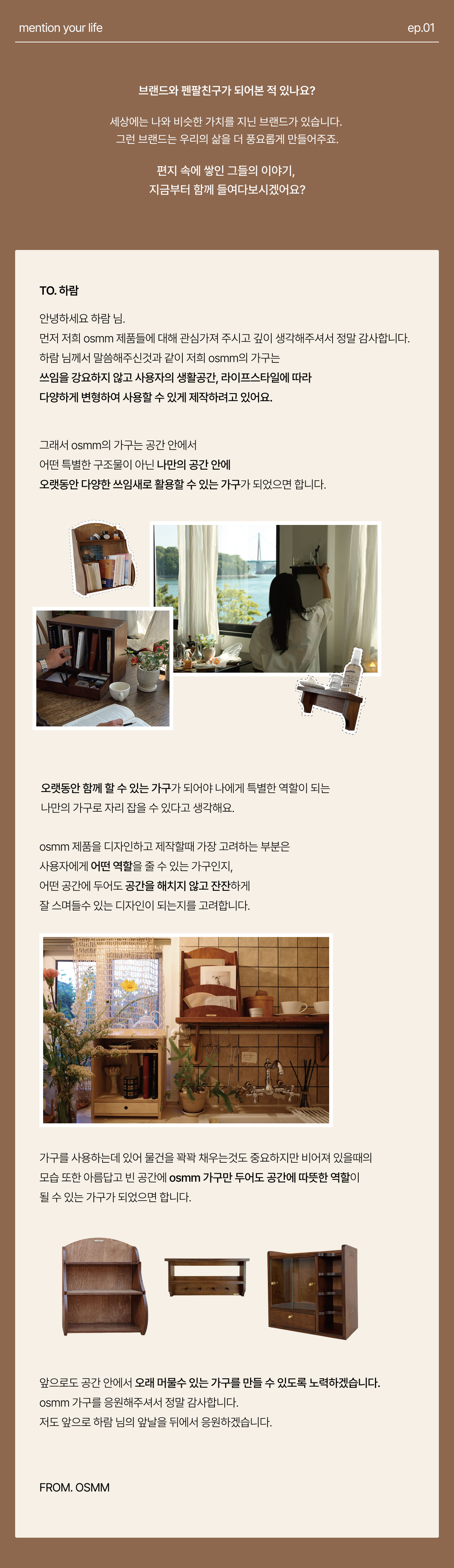 osmm은 ' our story in varied moment ' 다양한 순간안에 우리의 이야기가 담겨져 있다 라는 뜻으로 , 여러분의 이야기를 담을 수 있는 가구로 여러분의 공간에 더 좋은 시너지가 되는 osmm 가구가 되었으면 합니다.