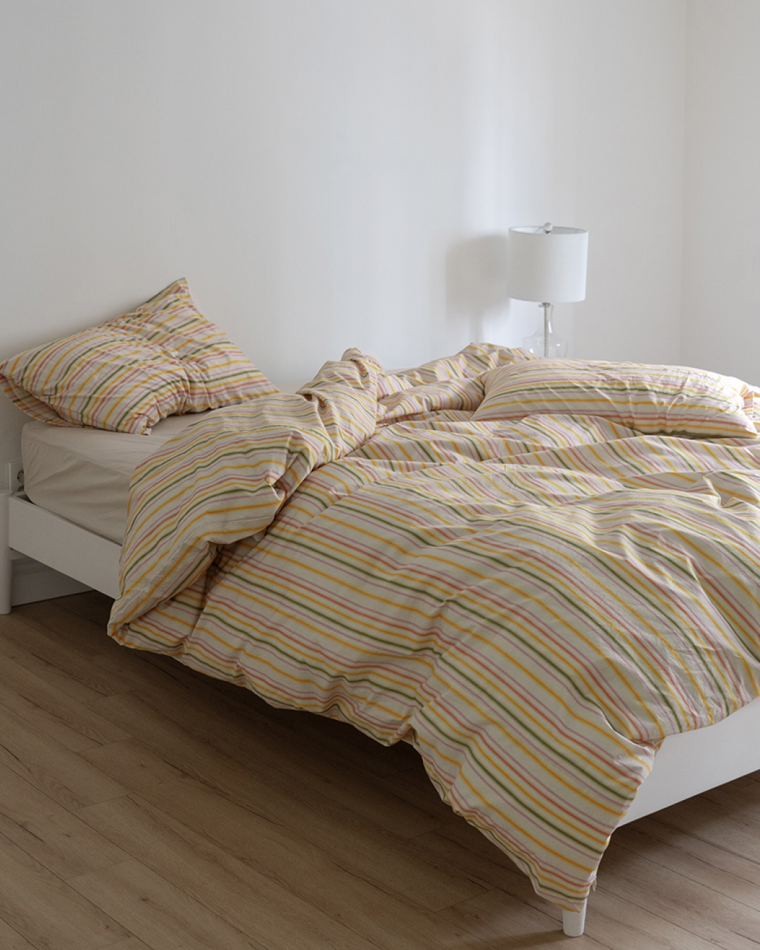 가죽 지갑이 시간에 따라 에이징되듯, 곤히의 룸 스트라이프 침구는 오래 봐도 질리지 않는 색을 담고 있습니다. 바랜 듯한 피치 톤이 공간을 부드럽게 감싸고, 은은한 광택의 면 소재가 피부에 편안하게 닿습니다. 먼지와 털이 잘 달라붙지 않아, 매일의 침실이 산뜻하게 유지되어요.