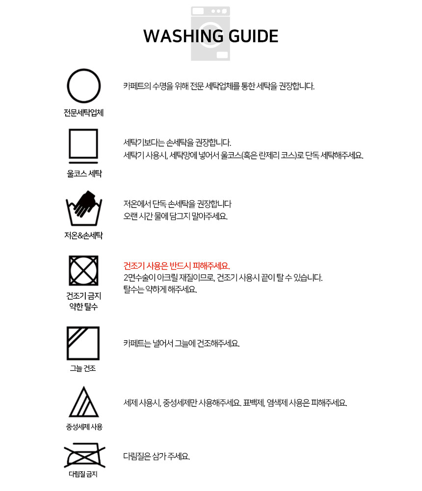 | 세탁방법 및 취급시 주의사항 | 세탁기 이용시, 찬 물에 중성세제와 세탁망을 이용하여 살살 돌려주세요. |