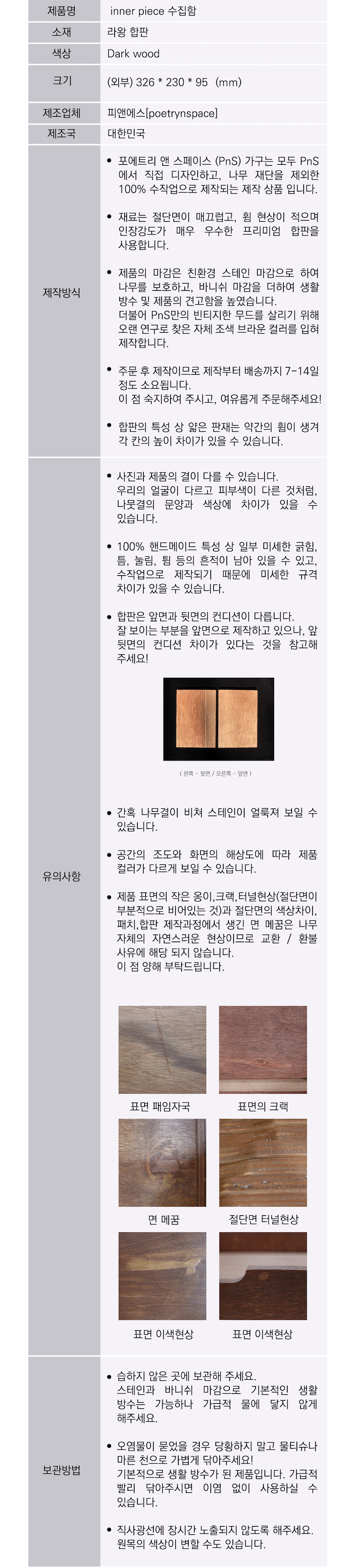 | 품질보증기준 | -제품에 하자가 있을 경우, 배송비는 pns에서 부담하여 새 제품으로 교환 해드리며 수령 후 7일 이후에는 교환 및 환불이 불가합니다. 상품을 받아보신 후 문제가 발견되는 즉시 카카오 채널 poetry n space로 문의 주세요! (상담 가능 시간 / 평일 9:00~18:00) 주문제작 상품으로 단순변심으로 인한 주문취소는 불가합니다. 반품시 판매자와 협의 후 진행하여야 하며 판매자와 상의 없이 임의로 반품하시면 반송될 수 있으며 왕복 배송비를 청구합니다. 합판의 특성에 관한 공지를 숙지해주시고, 합판 특성으로 인한 사유는 교환/환불이 불가합니다. |