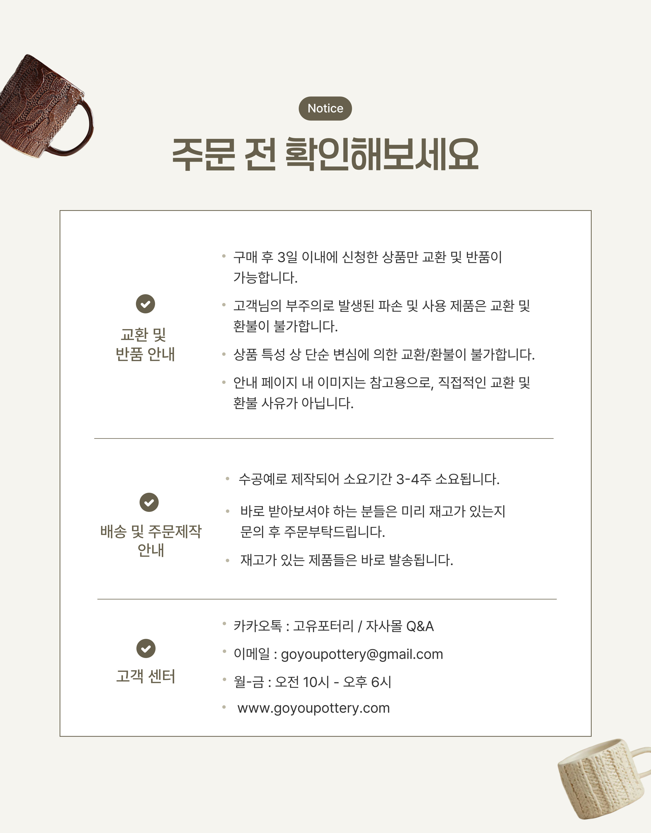- 얼리 등 주문제작상품 등은 변심에 따른 반품 / 환불이 불가합니다.