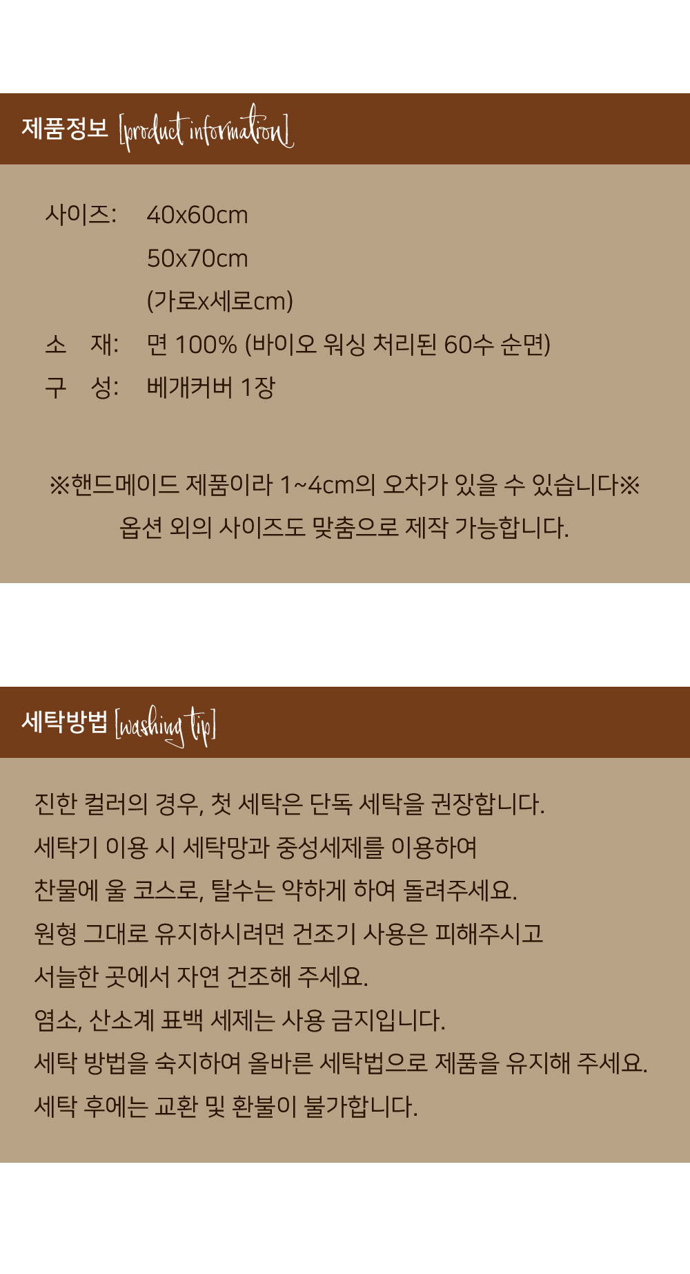 | 세탁방법 및 취급시 주의사항 | 진한 컬러의 경우, 첫 세탁은 단독 세탁을 권장합니다. 세탁기 이용 시 세탁망과 중성세제를 이용하여 찬물에 울코스로, 탈수는 약하게 하여 돌려주세요. 원형 그대로 유지하려면 가급적이면 건조기 사용은 피해주시고 서늘한 곳에서 자연 건조해 주세요. 염소, 산소계 표백 세제는 사용을 금지합니다. 세탁 방법을 숙지하여 올바른 세탁법으로 제품을 유지해 주세요. 세탁 후에는 제품의 교환 및 환불이 불가합니다. |
